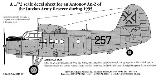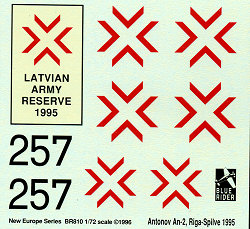 One of those interesting aircraft came from the Baltic state of Latvia. One of their ubiquitous An-2s was given an 'X' insignia marking that was somewhat reminiscent of the red swastikas used before WWII. Of course, using those markings today would not be politically correct, and Latvia uses something quite different on their military planes. The markings were used in 1995 and this plane was spotted at Riga-Spilve during that time. From what little I've been able to find on the subject, apparently these markings are still current.