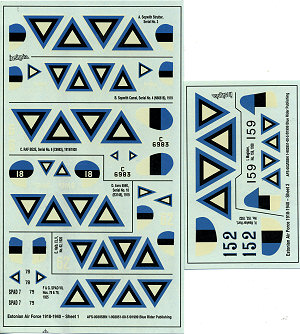 Not in any particular order, there are markings for a Hawker Hart, Miles Magister, Spad VII, Halberstadt CL.IV, Avro 504K, Be.2E, Sopwith Camel and Sopwith Strutter. Each set of markings includes rudder stripes. They are printed by Blue Rider so are a known quality. Though some may have wished for other options, the drawings that are included will allow the builder to perhaps do some decal bashing to get the markings that are needed. these planes seem to have been somewhat devoid of anything aside from insignia and numbers.