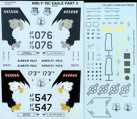 These are designed for the Tamiya kit, but may well fit the Revell kit, which is, I believe, the only other 1/32 Eagle kit out there. The decals are superbly printed and provide a full stencil and insignia suite for one aircraft. Instructions are superbly done and provide not only full color and markings guide, but any notes appropriate for each aircraft in terms of mods.