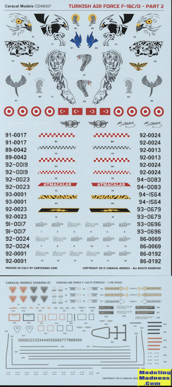 The instructions do not recommend any specific kit, but there are a lot of them out there in this scale so finding one that is appropriate should not be an issue at all. I think that Kinetic does a dedicated Turkish AF boxing. The decals themselves are superbly printed by Cartograf so you know you are getting the best. While only one stencil sheet is provided, Caracal offers additional sheets for $5.99.