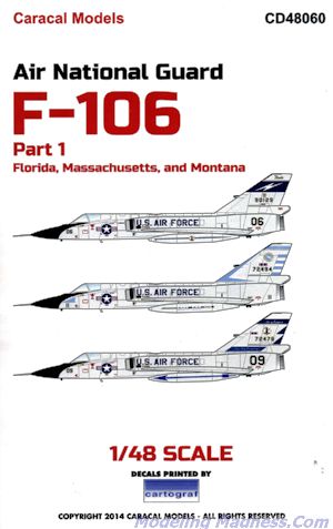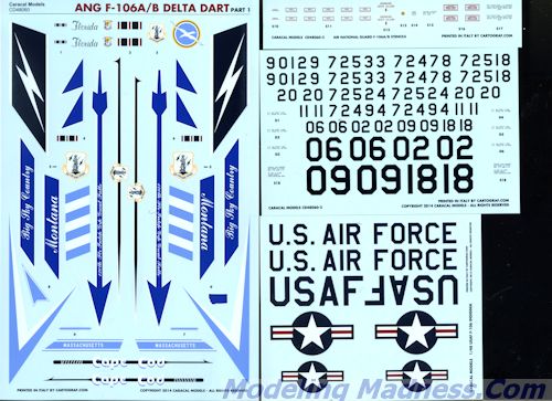 For their next sheet, Caracal Models has returned to doing Air National Guard planes and this time has chosen the F-106. This is a nice choice and the set offers markings for six planes from three different units. All of these planes are overall ADC Grey (FS 16473) with black radomes and anti-glare panels. The set includes enough common markings for one aircraft, however, the Monogram kit (now Revell kit) has a great decal sheet and you can easily snag these common bits for additional builds.