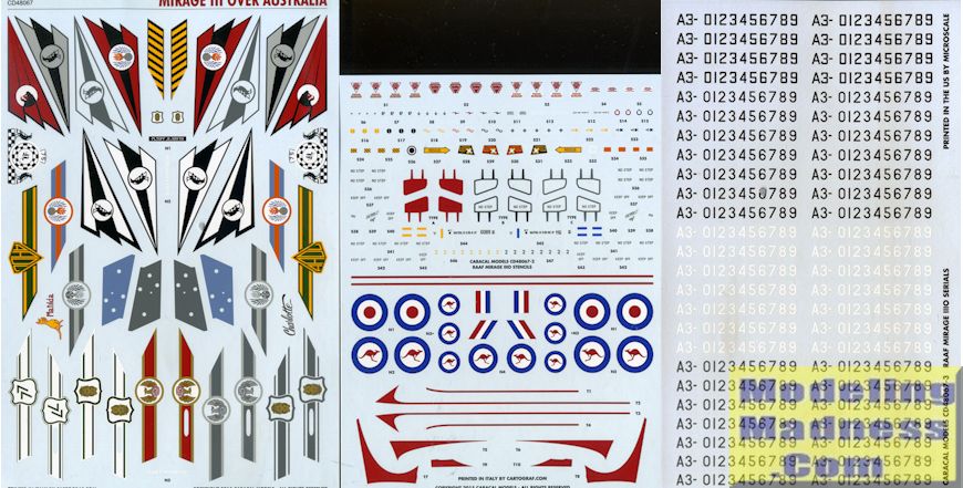 The set includes three sheets with one sheet being serials in various colors and fonts so you could literally do any aircraft of which you have a photo. Caracal Decals includes a nice full color decal placement guide, but such is the scope of the set that all the upper and lower views as well as the profiles of several of the options are on-line and you'll need to print those out if you wish to have them. When I printed out the upper and lower schemes for the green/grey aircraft, the green and grey were so close to each other that on my printer, they almost look like a single color so you may wish to copy that sheet and adjust the colors before printing it.