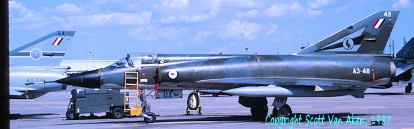 The decals themselves are superbly printed by both Cartograf and Microscale. I dare say you could do several aircraft from this set if you choose wisely. One thing I noticed when I photographed a number of aircraft in 1987 was that many of the grey planes had darker grey on the leading edges of the fin and wing. I couldn't find any more full images of these Mirages, but have included this one of a green/grey version that shows the tail of one of these planes. It may prove useful to you. Those of you who have MMP Books' "Mirage IIIEO Camouflage and Markings" book will find a lot more in the way of standard and experimental camo schemes which will prove useful if you want something different.