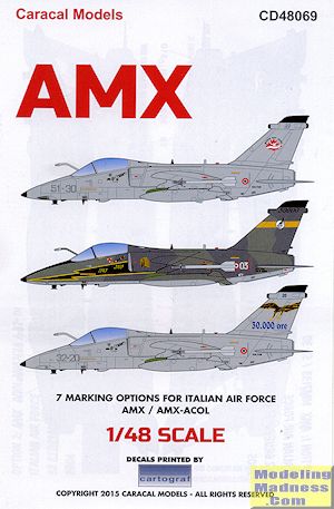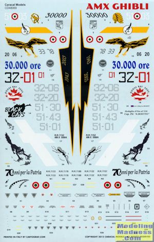 The 51 Stormo has one painted up like their previous G.91s in green/grey camo. There is also one to commemorate a Goose Bay deployment in 2005, and a 'Black Cats' Afghanistan deployment. Note also that there is an AMX-ACOL type which has a slightly different nose that is basically less pointed. This is called out in the instructions. FCM will be doing a sheet for Brazilian aircraft so Caracal Models has concentrated on the Italian ones with this sheet. The sheet is printed by Cartograf and the full color instruction booklet provides lots of information.