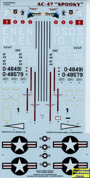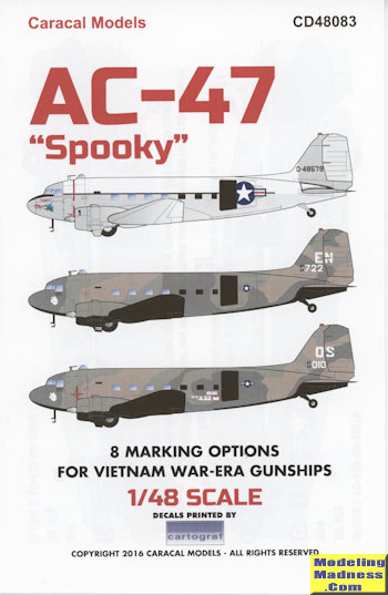 The first two are FC-47s, as the type was first listed. The second plane has the interim armament of 10 .30 caliber guns instead of the miniguns. The first one has the nose artwork taken from period photographs so you know it is accurate. The rest are in the SEA camouflage scheme, many of them with black undersides. The first option has sections painted in what is listed as gull grey and the second is in overall gull grey. Both are probably supposed to be light gull grey as the dark is an interior color. I'm of the opinion that these were really in ADC grey as the gull grey colors are Navy and probably not one that USAF overhaul facilities would have on hand, but the choice is yours.