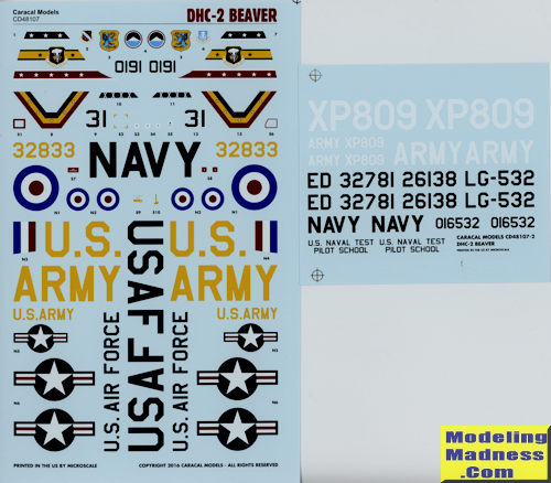 The type was initially categorized as the L-20. After the 1962 combination of military aircraft nomenclature, it was the U-6. This sheet contains markings for six different aircraft. For kits, I believe the only one that has been done in this scale is by Hobbycraft. These decals are superbly printed by Microscale, one of the best in the industry.