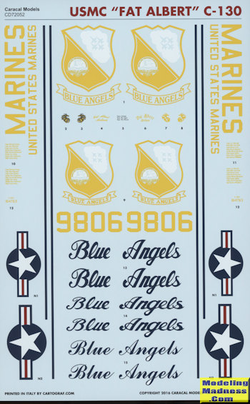 The yellow markings will need to be masked and painted by the builder, with Caracal's web site providing additional photos to help with this. Basically one uses the Italeri C-130H for this sheet as the H and T are pretty much the same airframe with different dash number engines. The instructions are superb and provide a lot of guidance. Decals are superbly printed by Cartograf in Italy so you know you are getting the best.