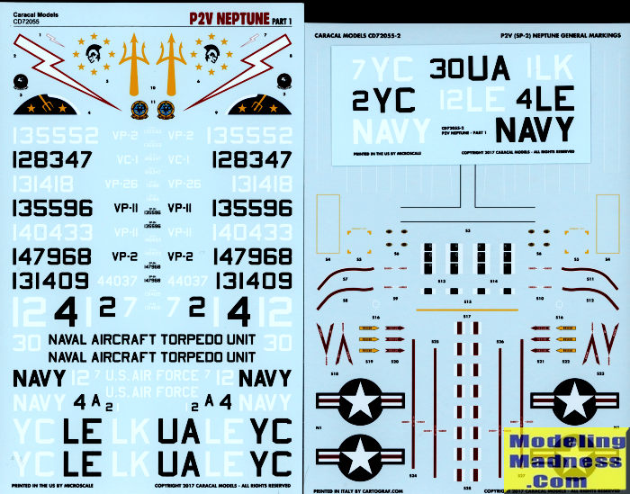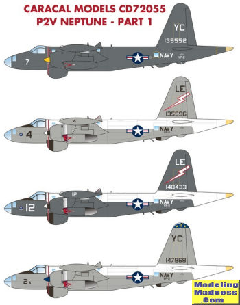 This particular sheet covers a variety of Neptunes, mostly -5 and -7s. The Hasegawa kit is a -7 with the main difference being the canopy as the one on the -5 if flat. To do a proper early Neptune, you'll need either an Airmodel conversion set or the Falcon triple conversion for the P2V-5. These can require a bit of looking, but they are out there. The instruction sheet includes a separate insert covering a lot of the differences. The upper and lower wing markings are provided via Caracal's on-line reference.