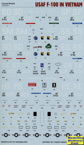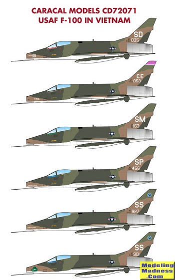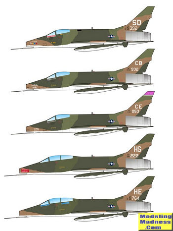This particular sheet provides markings for eleven SEA camouflaged Huns. There is a nice mixture of single and twin seat planes from pretty well all the units that flew it. A few things to note. One is that when freshly painted, paint covered the afterburner area, but was rather quickly burned off. This accounts for some of the rather ratty looking rear fuselages on painted F-100s. Secondly, though the instructions don't mention it, I'm pretty sure all these planes would have had the larger 335 gallon wing tanks and not the smaller 275 gallon versions. If your kit has the smaller ones, you can insert a tubular plug in the middle to represent this.