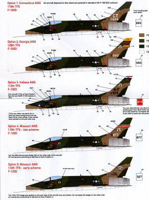 A few of these planes have some special markings. The 113 TFS F-100D has the name 'City of Terra Haute' and was the last ANG F-100 to fly in 1979 (It ended up being the YQF-100D and expended in 1983. Thanks to Dave Cook for that info) while the 110 TFS F-100D has a bicentennal ANG badge. The decals themselves are superbly printed, crisply done and in full registration by Microscale, so they will work well with the weaker setting solutions. They are designed for the Trumpeter kits but should work with the older Monogram version as well.
