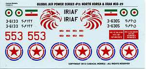 THe next one is from the 11 TFS, IRIAF based at Tehran. This aircraft is in the desert scheme of FS 33354 sand and FS35526 blue grey with the blue grey being the underside color as well. It carries the Eagle motif on the fin to commemorate 20 years of MiG-29 operations. Note that the aircraft only has the insignia on the fuselage, though a second set has also been included. This plane has no anti-glare panel on the nose. A second set of serial numbers has been included if you wish to do a plane with the black nose panel.