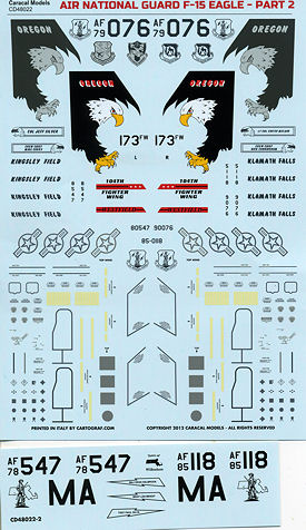 The sheet contains sufficient insignia and data markings to allow two of the options to be done so you can either do both Oregon planes or one each of the Oregon and Massachusetts birds. As with all Caracal decals, this sheet is superbly printed by Cartograf so you are assured of getting the best.