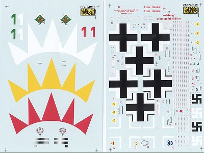 What takes up most of the unique sheet are the three colors for the nose markings. These must be carefully placed in the proper order so that they will turn out well. The other sheet in this set is for common markings and insignia. CE provides all possible combinations of insignia types on this sheet and there are more than enough to do a single aircraft such as this. The end result will be a very colorful 109G-6!