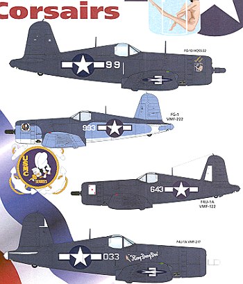 The tricolor Corsair is from VMF-222 on Samar during March of 1944. It has a nice USMC/Seabees badge on the cowling.