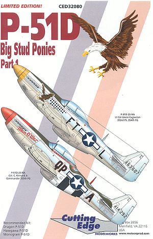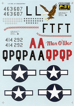 The other is 'Man O War from the 355FGs commander, C. Kinnard. This one has some complex uper surface Olive Drab markings. The sheet states that there is a mask for this scheme available (CEBM32093) to assist with painting this one. Red spinner, forward nose and radio mast. To provide no registration problems, the code letters are separate.