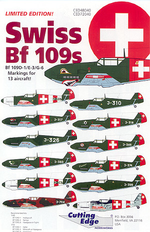 Included is a rather comprehensive data sheet. Apparently most Swiss 1009s were different in a number of ways from the standard German versions. This includes different guns, control columns and props among the most visible differences. None of the modifications seems overly complex so most should be able to make the changes without too much trouble. The instructions also include some notes on specific aircraft and a stencil placement guide. The sheet also provides options for a wide range of markings options as Swiss 109 markings did change over the years.