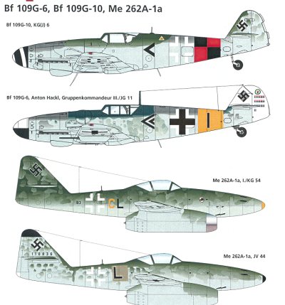 Me-262A is from I./KG 54 and is in RLM 83 over 76. The only distinctive marking