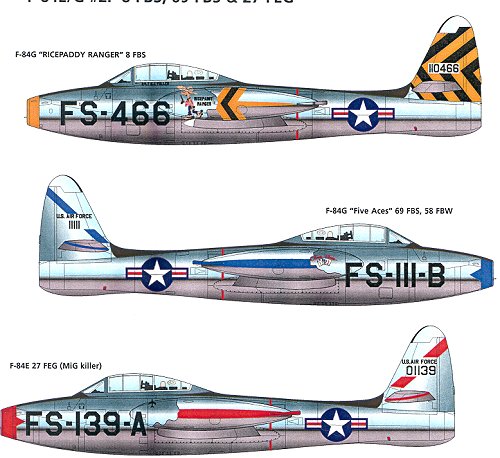 Anyway, there are three aircraft. The first is an F-84G from the 8 FBS called 'Rice Paddy Ranger'. The nose art is offered as a two piece affair in case you prefer it that way. Next is another F-84G from the 69 FBS called 'Five Aces'. Finally there is the lone F-84E and one of the few Mig Killer Thunderjets of the war. This one is from the 27 FEG.