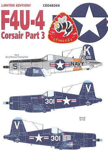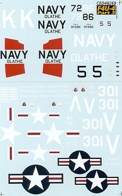 If you are wondering about kits, there are a few available. From Hasegawa comes the old Mania kit with raised panel lines. Academy does an F4U-4B, which most shy away from as it apparently isn't a very good model. The other that is even older is the Monogram version with all the working bits. There is (or was) a conversion for the Tamiya Corsairs (or was that for the Hasegawa -5N?). Regardless, this sheet will make for a very nice model. I should point out that on all decal sheet images, I darken them so that the white will stand out so the Olathe fuselage band isn't really that dark.