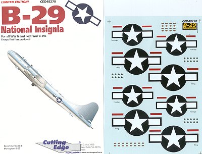 These insignia sheets are done to facilitate some of the decal sheets that have been done by various decal makers that don't include insignia. Thanks to the size of 1/48 bomber markings, that is not always possible. It is also nice to have some large insignia available to replace kit decals or to fix the odd decal disaster.