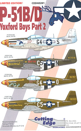 All three of the camouflaged Mustangs had the white ID stripes around the tail planes and on the upper wing (at least, that is how it appears from the instructions). The Instructions are a gold mine of information as these aircraft have all been as thoroughly researched as they can be. Optional markings are provided where research is inconclusive. This is a trademark of Cutting Edge and allows you to have the most accurate model markings available.