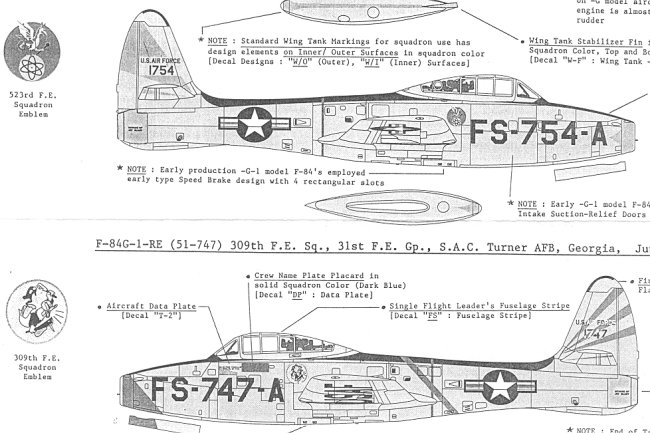 First is an F-84G-1 from the 523 FES/27 FEG. from Bergstrom, Texas in mid-1952. This plane is predominantly yellow and has a complete set of data markings, including those for a Mk.7 atomic bomb.