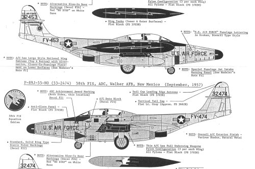 This particular sheet has markings for three F-89s in the last years of USAF usage. All of the aircraft are in unpainted natural metal with black radomes and anti-glare panels.