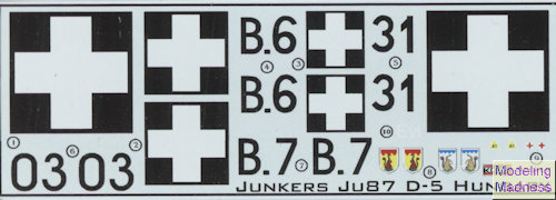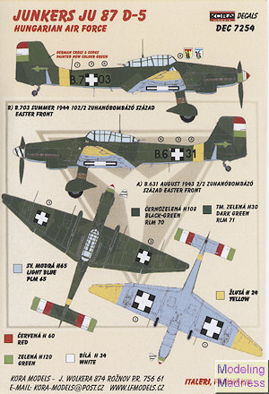 Kora's sheet is not very large, measuring about 3 1/2 by 1 1/4 inches in size. It contains markings for two aircraft that differ only in the code letters used. The planes are painted in the standard RLM 70/71/65 with red, white, & green bands on the rudder and horizontal stabilizers. There was also a yellow fuselage band and this same color was used under the wing tips. One plane has the spinner in the national colors while the other has a white spinner with black spiral. The decals are designed for either the Italeri or Fujimi kit since they are the only folks who do the D-5 variant in this scale. As to which is better, it is really a tossup. There are enough insignia for one aircraft and you get alternate unit badges. One thing that is missing from the sheet is the additional bit that would fit atop the dive brakes. I guess one will need to paint those on as well.