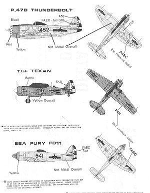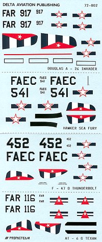 Well, what is on this interesting little sheet? Well, the first subject is for an A-26C Invader (not shown on placement sheet). Like all but the Texan, it is overall natural metal, but instead of FAEC markings, it has FAR marks (as does the T-6). Though not mentioned in the sheet, I think this is one of the CIA aircraft that was flown to Miami trying to represent a defecting Cuban crew. Your only choice for a kit for this plane is the old Airfix kit.