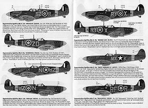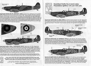 This decal sheet goes with the Dutch Profiles book on Dutch Indies Presentation Spitfires, and provides markings for eleven aircraft. There are two main schemes for the Spitfires on this sheet. One is the older Temperate Scheme of Dark Earth/Dark Green over Sky, and the other is the later 'Mixed' Grey/Dark Green over Medium Sea Grey. The latter scheme has yellow leading edges to the outer wings.