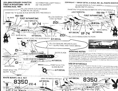 Another of their sheets was this one on special Navy F-4 Phantoms released in 1984. The research into each subject is impeccable as you would expect from Bert Kinzey, and the sheet includes photos of the actual aircraft to assist modelers in placement (see the representative section below). Though the sheet is designed for the Hasegawa F-4J, I am sure it will work equally well on the Monogram or ESCI Phantoms.