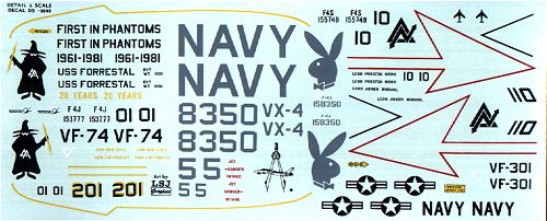 There are three subjects on this sheet. The first one is a Ferris painted MiG killer from VF-301 in 1983. A complete painting guide including FS numbers is given. I have done this particular scheme in 1/72 using a Fujimi F-4S and it is striking. The second scheme is for an F-4J from VF-74 in 1981. It depicts an aircraft painted to commemorate the 20th anniversary of Phantom use with the squadron. A mask is given for the black anti-glare section so the yellow outline can be properly installed. The final scheme is for an all-white aircraft of VX-4. Called the White Bunny, this aircraft is a bit unusual in having all the standard markings in grey instead of black. None of the three aircraft have a full stencil load so that should appeal to those who detest putting them on their aircraft.