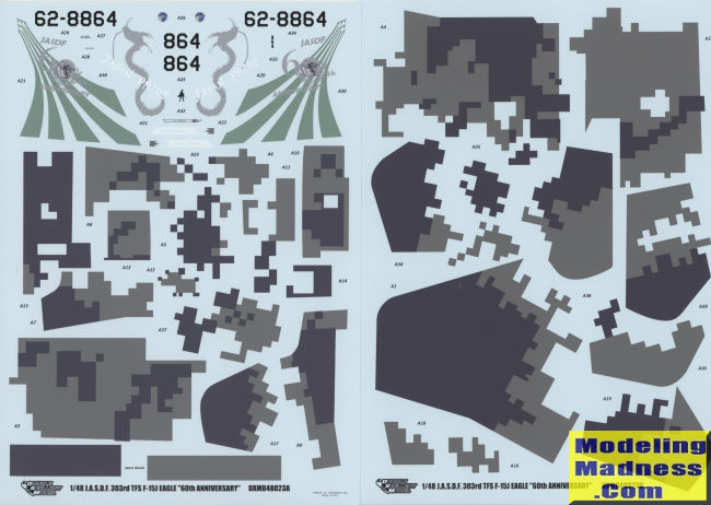 This special scheme is, from what I understand, a one off for the F-15 and is applied to their display aircraft. The markings denote the 60th anniversary of the JASDF and are really quite complex looking. The set includes two full sheets and a half sheet. In 1/48, the Eagle is not a small airplane. Japanese Eagles are painted in the 'old' F-15 colors of light and dark Compass Ghost Grey which one can see beneath all the digital markings.