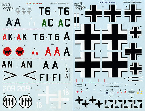 The sheet is superbly printed by Cartograf. There are markings enough to do one German and the Italian aircraft with data markings for one. The swastikas are segmented so the sheet can be sold in those countries squeamish about the marking. A proper touch is that there are additional bits of the underwing insignia to go on the dive brakes, something a few kit makers have missed.