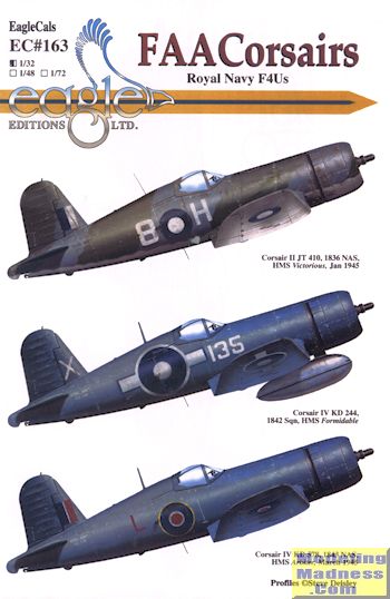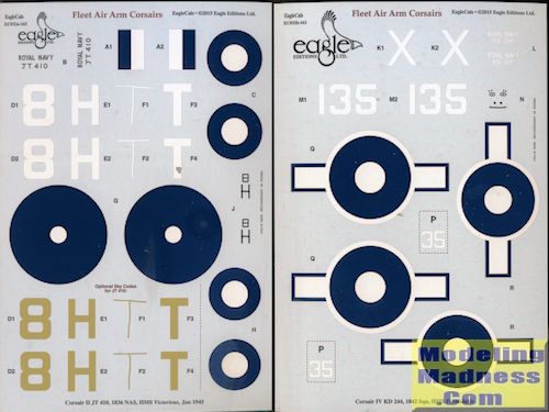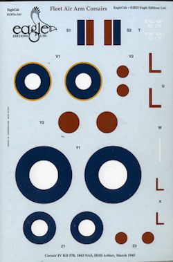 This latest set from EagleCals is in 1/32 scale and covers British Navy's use of the F4U-1 Corsair. You have several kits available for this including the new F4U-1A from Tamiya. Note that all the options have the framed 'blown' canopy. I should mention that this sheet is also available in 1/72 and 1/48 scale.
