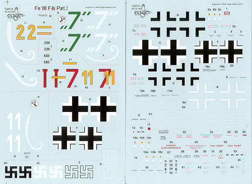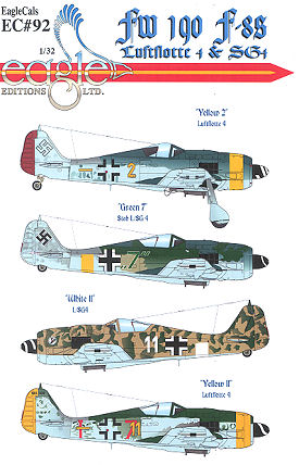 This sheet is one for the ground attack FW-190F-8. There are two ways to get an F-8 variant in 1/32. One is to find the Revell kit and the other is to use the Hasegawa kit and aftermarket parts to update the A-8 variant into an F-8. Hasegawa apparently also has a dedicated F-8 variant if you wish to go that route. Eagle Parts has a number of bits that are useful in accurizing your 1/32 FW-190.