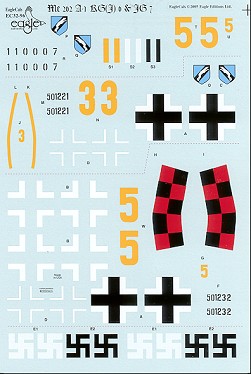 The modeler will have to paint the JG 7 fuselage bands on both aircraft. The sheet includes enough insignia to do two of the options.