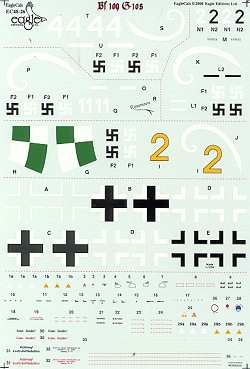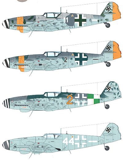 The final scheme is a plane of II./NJG 11. These night attack planes were in overall RLM 76. They also had a small sliding panel in the canopy and extended exhaust shields to keep from blinding the pilot. Many of these planes also had whistles attached to the shields so that friendly gunners could hear them and not fire on the plane.