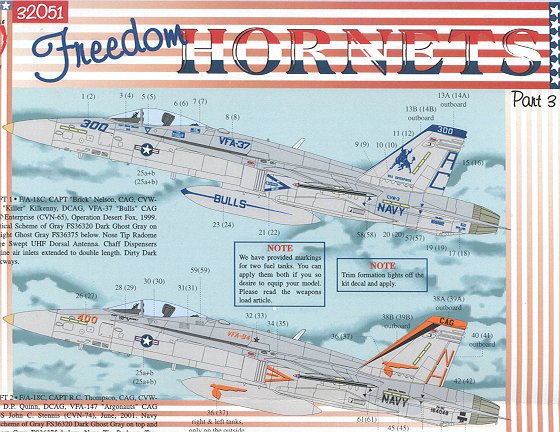 First is the CAG bird from VFA-37 aboard the USS Enterprise during Operation Desert Fox in 1999. Note that this and the other aircraft on the sheet have the swept back UHF antenna on the upper spine. Though the sheet claims there are decals for two fuel tanks for this plane, only one is on the sheet for this particular plane.