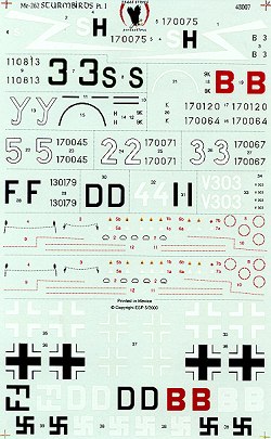 What we have here is a sheet for a LOT of Me-262s. But since the differences between them (decal-wise) is only the aircraft number and perhaps serial, it is easy to cram a lot of stuff onto one sheet. There are enough common markings to do two aircraft. These should work on the Monogram, Lindberg, Dragon/DML/Italeri/Revell and Tamiya kit just fine. In fact, it duplicates several of the Tamiya decal options. This is one of the first sheets done by Eagle Strike in mid 2000 when the old owner of Aeromaster saw that his company was going on the skids and started Eagle Strike. The instructions are in grey scale and the sheet price is a very reasonable $6. That has since changed as they've gone to color and a higher price.