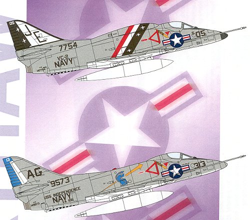 The first plane is from VC-2 and is an A-4L. Basically the L is a C version with the avionics hump and equipment from the A-4F. If you have built the Hasegawa A-4E/F as an E, then you may have this part left over to use on the C kit. Same goes for the Hobbycraft kit. With this particular scheme you'll have to paint the tail dark Navy Blue. The sheet states that it is black, but I'm not positive that it should be. I do know that before I paint my Skyhawk, I'll closely go over the slides I have of VC-2 aircraft.