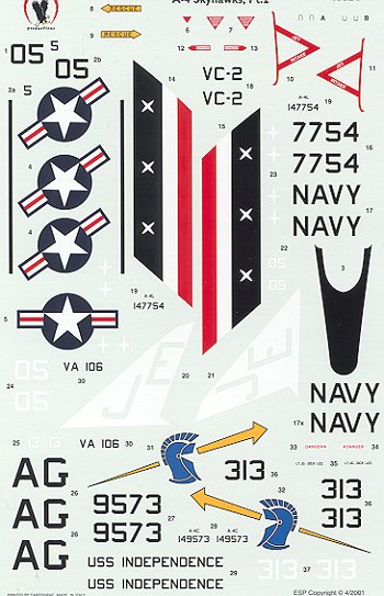 The other is an A-4C from VA-106, which is now the East Coast F-18 training squadron. As with the previous aircraft, you'll have to paint the tail light blue, mask off each of the segments and paint the ribs white. You will also have to paint the lips of the engine intake to match the warning decals.