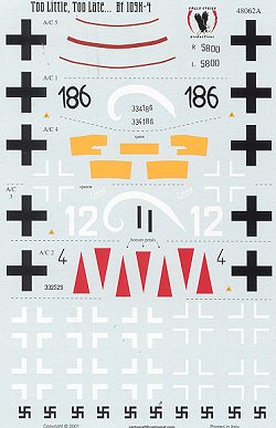 This particular sheet is for the last version of the 109 to be mass produced; the Bf-109K-4. Such was the state of the war in the last 6-9 months, that often planes were flown as they came from the factory. This meant no unit markings as there wasn't time. Often all that was used to identify a plane were the portions of the serial number painted on the aft fuselage. Several of these aircraft are on this sheet. One other thing is that most of these planes have been done on sheets of other companies so it is quite possible that the dedicated 109 decal collector already has them in their collection...somewhere!