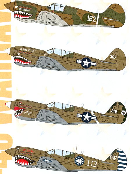Suggested kits are the AMT ones, though you could use the Mauve P-40N as well. Perhaps this sheet will fit the upcoming kits from Accurate Models (assuming they even get produced).