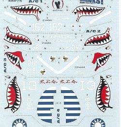 This sheet offers four subjects; all of them camouflaged and all with sharkmouths of various designs. There are enough insignia to do three of the planes if you are careful about your choices.
