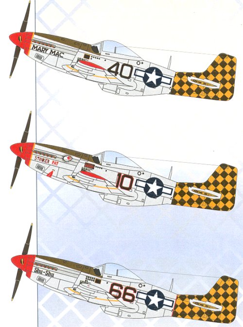 First is 'Mary Mac' from the 318th FS. This aircraft has the full color treatment that includes red wing tips and a yellow stripe behind the red nose .