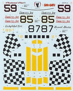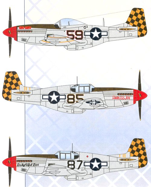 This is the second sheet covering the 'Checkertail Clan' during its Mustang time period. All are in overall natural metal with the smaller checkertail area than was on the first sheet. Please note that the B models have field applied fin fillets that were about 2 inches longer and taller than those applied at the factory. There are enough common markings and insignia for two planes and checkers for one. The recommended kit is the Tamiya version, though the ICM, Monogram or others could probably be used just as well.