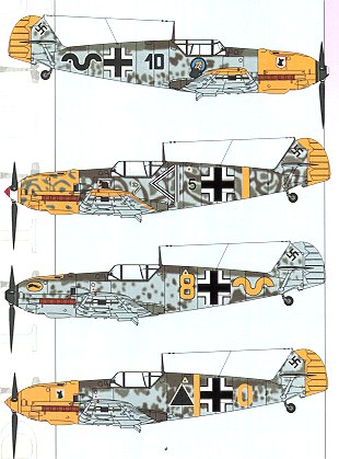 Finally an E-7 variant from III./JG 77. Each Geschwader had to have several dedicated Jabo (or ground attack) units and this is one of those planes. Unusually, there is no bomb rack noted on the drawing. Usual yellow nose and rudder with a thin yellow fuselage band. Pointed spinner.