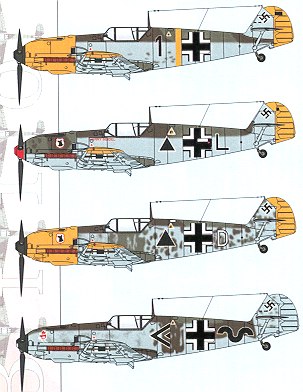 First is a Bf-109E-1 updated to a -7 from 5./JG 77. OK. Black 1 is in RLM 71/02 65 with a semi low demarcation line and no mottling at all. It has the standard Balkan markings of a yellow nose, rudder, lower wing tips and fuselage band.