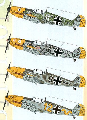 Finally, from 9./JG 52 is this E-1 in standard RLM 71/02/65 camouflage. Yellow 12 has no wing tip markings as normally carried. The yellow rudder appears partially oversprayed in the same very light mottling as on the fuselage side.